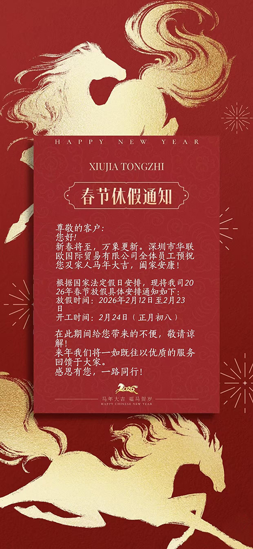 律回春渐,新元肇启。值此 2026 丙午马年新春佳节来临之际,深圳市华联欧国际贸易有限公司向您致以最诚挚的节日问候和衷心的感谢!